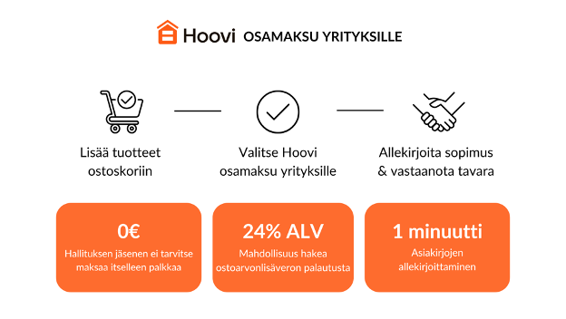Hoovin yrityksille suunnattu osamaksusuunnitelma toimii samalla tavalla kuin yksityisasiakkaiden keskuudessa suosituksi tulleet osamaksuratkaisut, mutta se on suunnattu 100-prosenttisesti yrityksille. Sopimus tehdään suoraan yrityksen kanssa, ja sama yritys maksaa kuukausierät – ei hallituksen jäsen henkilökohtaisesti. Ostetut tavarat siirtyvät yrityksen omaisuudeksi ostosta lähtien ja ne voidaan merkitä sen taseeseen.